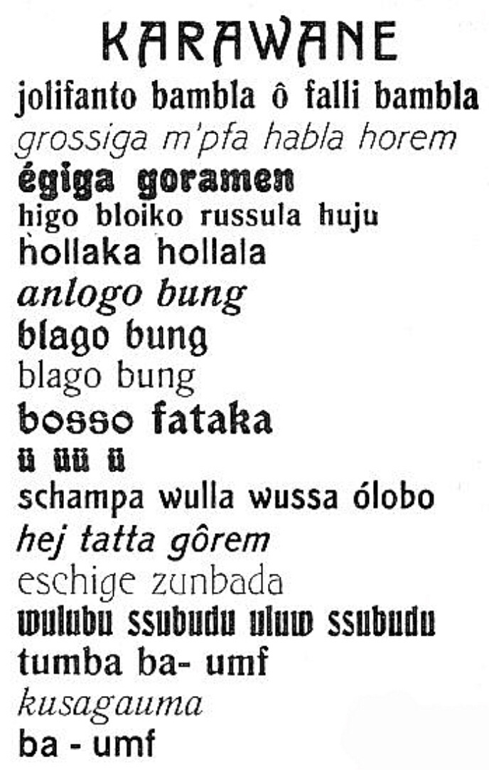 In poetry, a German named Hugo Ball, wrote a poem in 1916, and declared it as part of a new genre of “sound poetry”. It was called “Karawane”. He performed it while wearing his “lobster suit”, certainly one of the first performance artists of the century.