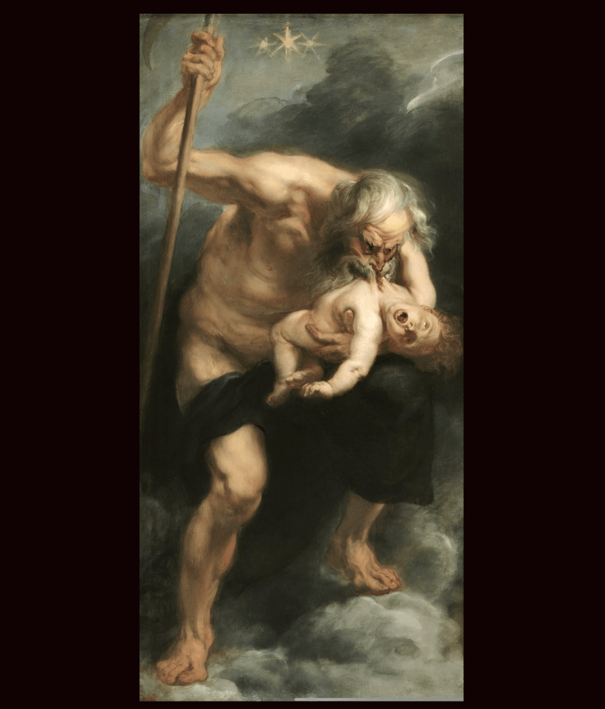 Cronus, having usurped his father Uranus to rule the Heavens, harbored the same apprehension. Upon Rhea’s childbirth, Cronus swiftly swallowed each infant, one by one. Yet, Zeus, the youngest, was spared when Rhea concealed a stone within swaddling clothes, tricking Cronus.