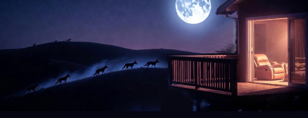 Out here, the city noise barely reaches me. Traffic dissolves into the distance. What remains is nature, and nature does not whisper. The coyotes conduct the darkness, tracing ridgelines, calling across creek beds. It sounds melodic until you realize it’s a map — and a hunt.