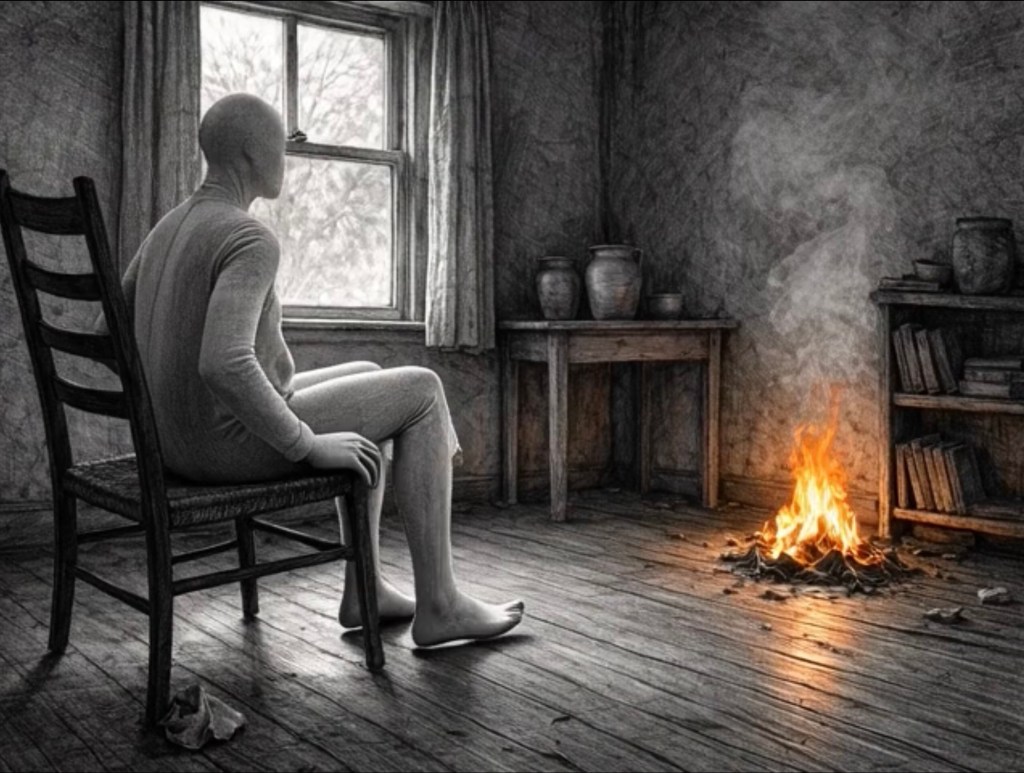 The chair remembers their shape, and releases them without complaint. The ‘someone’ steps toward the window, close enough for the glass to catch their breath and fog the courtyard into a soft, trembling blur.