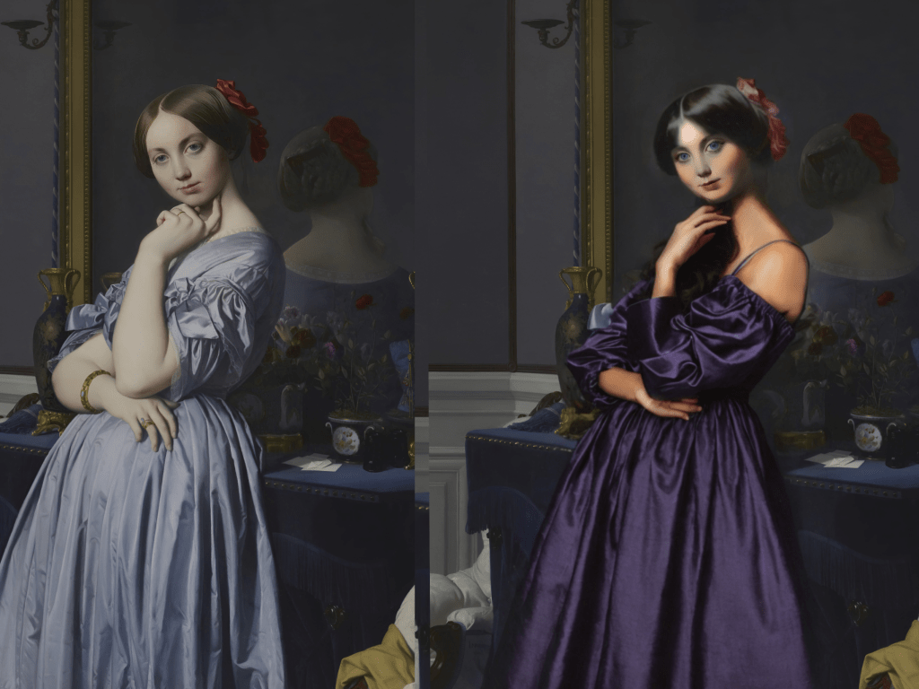 I started collecting the photos and the scans of paintings that I liked based upon composition, palette, and general quality. Some I had to colorize after raising the resolution and repairing the scan. Some I had to radically increase the saturation to get the right color. Of course all this filtering wiped out fine details, so I had to add layers of detail, focusing on eyes, hair, and skin tones.