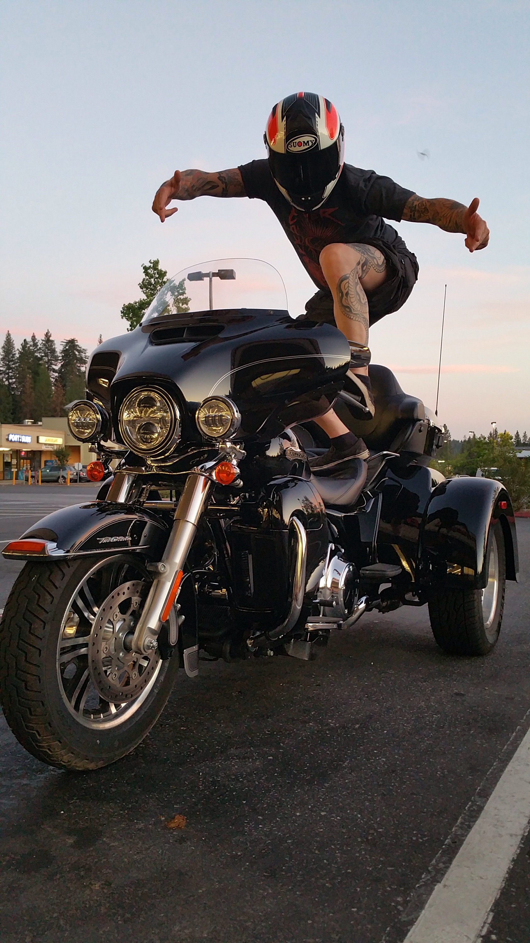Dinner was a little too far for a walk, but too close to ride both bikes. I asked Matthew to drive me over on the trike. He always had style.