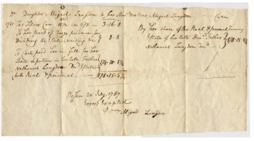 “1767 To 1 Silver Can 11 1/2 oz. a 6/8 – 3•16•8 To her part of charge paid men for Dividing the Estate writing & c 8•8 To cash paid her in full for her Share or portion in her late Father 174•10•1 1/4 Nathaniel Langdon Dec’ Estate Both real & personal, _____ 178•15•5 1/4 Boston 20 July 1767 Errors Excepted Abigail Langdon