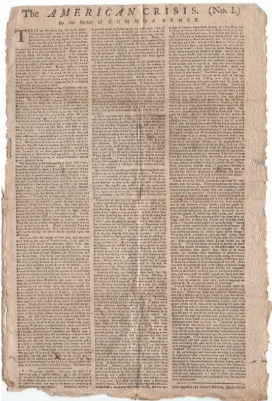 THESE are the times that try men’s souls. The summer soldier and the sunshine patriot will, in this crisis, shrink from the service of their country; but he that stands it now, deserves the love and thanks of man and woman. Tyranny, like hell, is not easily conquered; yet we have this consolation with us, that the harder the conflict, the more glorious the triumph. What we obtain too cheap, we esteem too lightly: it is dearness only that gives every thing its value. Heaven knows how to put a proper price upon its goods; and it would be strange indeed if so celestial an article as freedom should not be highly rated. Britain, with an army to enforce her tyranny, has declared that she has a right (not only to tax) but “to bind us in all cases whatsoever,” and if being bound in that manner, is not slavery, then is there not such a thing as slavery upon earth. Even the expression is impious; for so unlimited a power can belong only to God. Whether the independence of the continent was declared too soon, or delayed too long, I will not now enter into as an argument; my own simple opinion is, that had it been eight months earlier, it would have been much better. We did not make a proper use of last winter, neither could we, while we were in a dependent state. However, the fault, if it were one, was all our own; we have none to blame but ourselves. But no great deal is lost yet. All that Howe has been doing for this month past, is rather a ravage than a conquest, which the spirit of the Jerseys, a year ago, would have quickly repulsed, and which time and a little resolution will soon recover. I have as little superstition in me as any man living, but my secret opinion has ever been, and still is, that God Almighty will not give up a people to military destruction, or leave them unsupportedly to perish, who have so earnestly and so repeatedly sought to avoid the calamities of war, by every decent method which wisdom could invent. Neither have I so much of the infidel in me, as to suppose that He has relinquished the government of the world, and given us up to the care of devils; and as I do not, I cannot see on what grounds the king of Britain can look up to heaven for help against us: a common murderer, a highwayman, or a housebreaker, has as good a pretence as he. ‘Tis surprising to see how rapidly a panic will sometimes run through a country. All nations and ages have been subject to them. Britain has trembled like an ague at the report of a French fleet of flat-bottomed boats; and in the fourteenth [fifteenth] century the whole English army, after ravaging the kingdom of France, was driven back like men petrified with fear; and this brave exploit was performed by a few broken forces collected and headed by a woman, Joan of Arc. Would that heaven might inspire some Jersey maid to spirit up her countrymen, and save her fair fellow sufferers from ravage and ravishment! Yet panics, in some cases, have their uses; they produce as much good as hurt. Their duration is always short; the mind soon grows through them, and acquires a firmer habit than before. But their peculiar advantage is, that they are the touchstones of sincerity and hypocrisy, and bring things and men to light, which might at a mill on a small creek, between the bridge and the ferry, and made their way through some marshy grounds up to the town of Hackensack, and there passed the river. We brought off as much baggage as the wagons could contain, the rest was lost. The simple object was to bring off the garrison, and march them on till they could be strengthened by the Jersey or Pennsylvania militia, so as to be enabled to make a stand. We staid four days at Newark, collected our out-posts with some of the Jersey militia, and marched out twice to meet the enemy, on being informed that they were advancing, though our numbers were greatly inferior to theirs. Howe, in my little opinion, committed a great error in generalship in not throwing a body of forces off from Staten Island through Amboy, by which means he might have seized all our stores at Brunswick, and intercepted our march into Pennsylvania; but if we believe the power of hell to be limited, we must likewise believe that their agents are under some providential control. I shall not now attempt to give all the particulars of our retreat to the Delaware; suffice it for the present to say, that both officers and men, though greatly harassed and fatigued, frequently without rest, covering, or provision, the inevitable consequences of a long retreat, bore it with a manly and martial spirit. All their wishes centred in one, which was, that the country would turn out and help them to drive the enemy back. Voltaire has remarked that King William never appeared to full advantage but in difficulties and in action; the same remark may be made on General Washington, for the character fits him. There is a natural firmness in some minds which cannot be unlocked by trifles, but which, when unlocked, discovers a cabinet of fortitude; and I reckon it among those kind of public blessings, which we do not immediately see, that God hath blessed him with uninterrupted health, and given him a mind that can even flourish upon care. I shall conclude this paper with some miscellaneous remarks on the state of our affairs; and shall begin with asking the following question, Why is it that the enemy have left the otherwise have lain forever undiscovered. In fact, they have the same effect on secret traitors, which an imaginary apparition would have upon a private murderer. They sift out the hidden thoughts of man, and hold them up in public to the world. Many a disguised Tory has lately shown his head, that shall penitentially solemnize with curses the day on which Howe arrived upon the Delaware. As I was with the troops at Fort Lee, and marched with them to the edge of Pennsylvania, I am well acquainted with many circumstances, which those who live at a distance know but little or nothing of. 