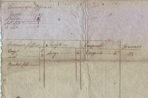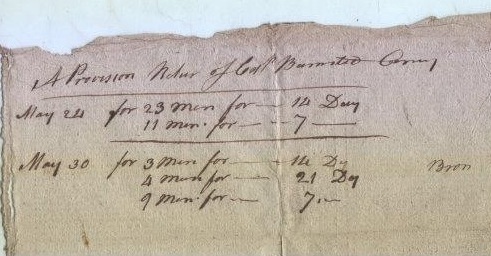 “A Provision Nature of Col. Bumstead Company” or something close to that. And then the writer has two dates… May 22 for 23 men for 14 days 11 men for 7 days May 30 for 3 men for 14 days 4 men for 21 days 9 men for 7 days Commission Officers Capts——–/1/ Ft Liet——-/3/ Sec Liet—–/1/ 3rd Liet——/1/ And finally a list Commissioned officers= 4, Sarg= 6, Corporals= 6, Drummers= 13